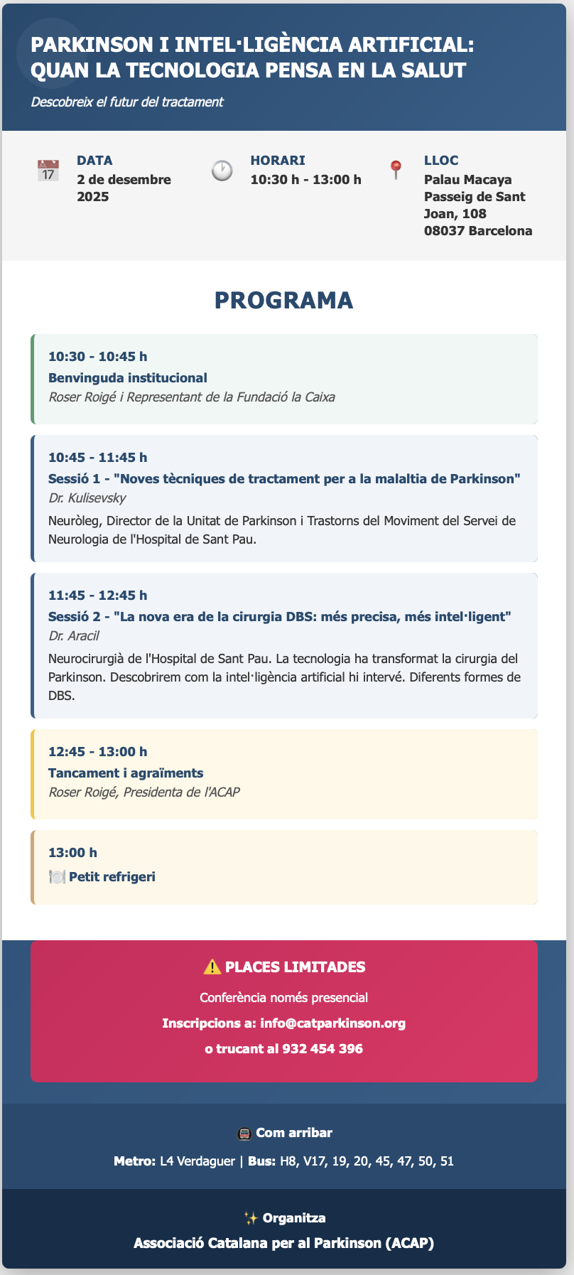 10:30 - 10:45 h Benvinguda institucional Roser Roigé i Representant de la Fundació la Caixa 10:45 - 11:45 h Sessió 1 - "Noves tècniques de tractament per a la malaltia de Parkinson" Dr. Kulisevsky Neuròleg, Director de la Unitat de Parkinson i Trastorns del Moviment...