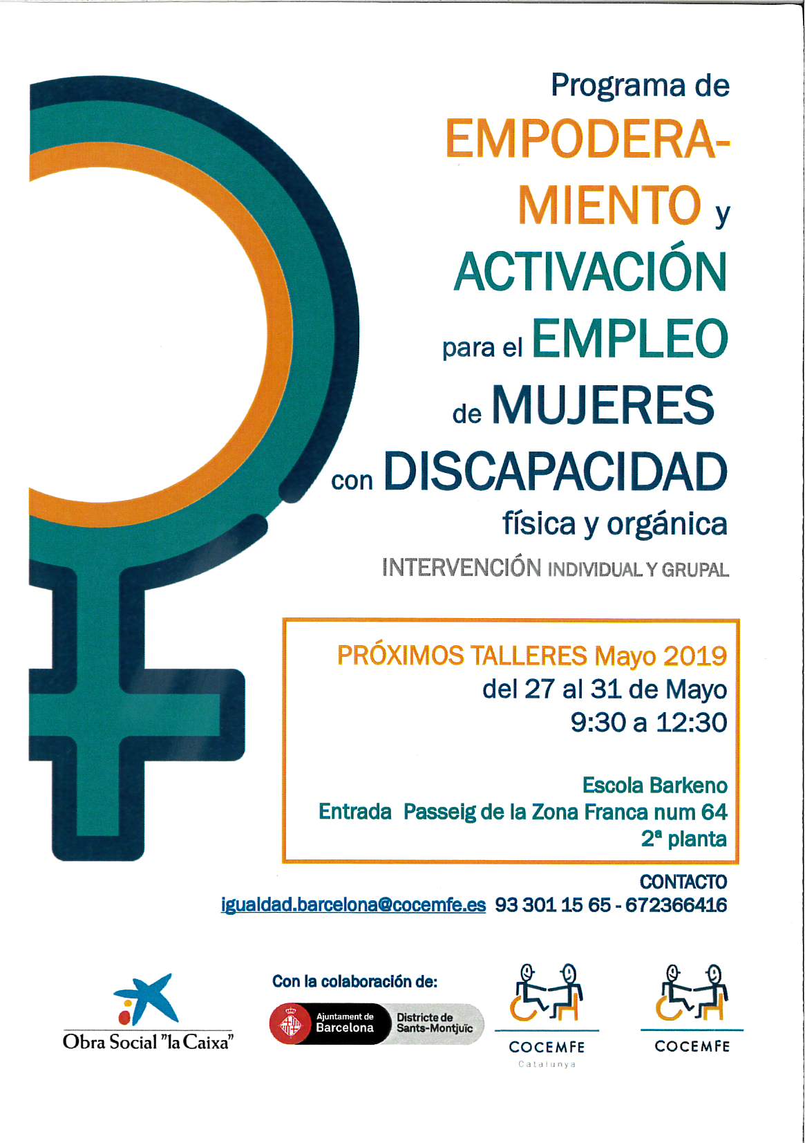 Cada dia del 27 al 31 de maig 2019 Horari: de 9.30 a 12.30 Lloc: Escola Barkeno - 2a planta (entrada per passeig Zona Franca 64) Barcelona, 23 de maig.- En marxa nous tallers per a dones amb discapacitat inclosos al Programa d'Apoderament i Activació per a...
