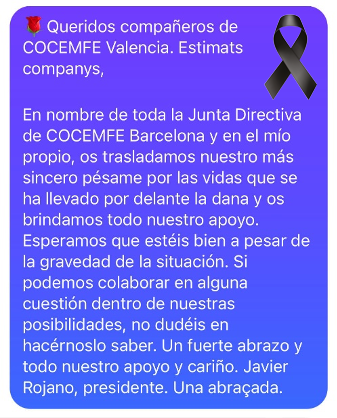 Barcelona, 4 de novembre de 2024 COCEMFE Barcelona ha fet arribar el seu suport a COCEMFE València i se solidaritza amb totes les persones afectades per la DANA al País Valencià. En nom de la Junta Directiva i en el seu propi el President de COCEMFE Barcelona ha...