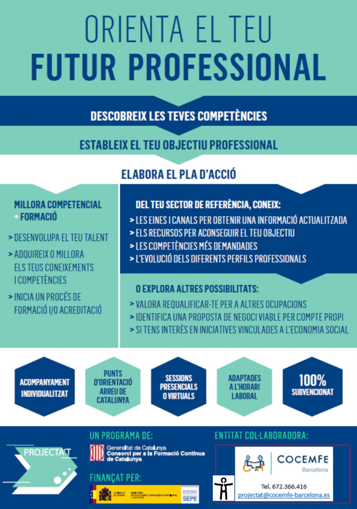 COCEMFE Barcelona, amb el suport del Consorci per a la Formació Contínua de Catalunya i el Servei Públic d’Ocupació Estatal, SEPE, impulsa actuacions d'orientació i de prospecció adreçades a persones treballadores ocupades, per tal d’acompanyar-les en el seu...